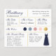 Um cartão de informações para madrinhas azul-marinho e dourado, incluindo informações sobre a data e local do casamento, as cores do casamento, os membros da comitiva, o vestido de madrinha e uma mensagem de convite para ser madrinha. O nome da madrinha e os títulos estão escritos em uma caligrafia elegante azul-marinho. No canto inferior direito, há um vestido azul-marinho. No centro, estão as cores do casamento em círculos. As cores, incluindo a cor do vestido de noiva, podem ser alteradas, com exceção do círculo dourado, que é de falso foil dourado. As cores padrão são azul-marinho, azul-pó, rosa-pó, rosa-bege e dourado.