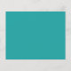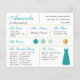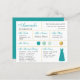 Um cartão de informações de madrinha para um casamento azul turquesa e dourado, incluindo informações sobre a data e local do casamento, as cores do casamento, o grupo da noiva, o vestido de madrinha e uma mensagem de proposta de madrinha. O nome da madrinha e os títulos são escritos em uma caligrafia elegante azul turquesa. No canto inferior direito, há um vestido azul turquesa. No centro, estão as cores do casamento em círculos. As cores, incluindo a cor do vestido de noiva, podem ser alteradas, com exceção do círculo dourado, que é de falso foil dourado. As cores padrão são azul turquesa, dois tons de menta, branco e dourado. O verso é azul turquesa, como a cor do vestido de madrinha.