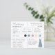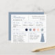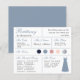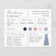 Um cartão de informações de dama de honra azul empoeirado e prata, incluindo informações sobre a data e local do casamento, as cores do casamento, o grupo da noiva, o vestido de dama de honra e uma mensagem de proposta de dama de honra. O nome da dama de honra e os títulos estão escritos em uma caligrafia elegante azul empoeirada. No canto inferior direito, há um vestido azul empoeirado. No centro, estão as cores do casamento em círculos. As cores, incluindo a cor do vestido de noiva, podem ser alteradas, com exceção do círculo prateado, que é de folha de prata falsa.