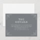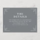 Este cartão de acompanhamento de casamento apresenta um layout minimalista e simétrico com um fundo cinza sólido que destaca o texto branco elegante e os elementos decorativos. O design inclui motivos geométricos elegantes nos cantos, adicionando um toque de sofisticação sem sobrecarregar a estética limpa. A tipografia centralizada em fontes serifadas em negrito enfatiza a clareza e a formalidade, tornando-a perfeita para transmitir detalhes essenciais. O clima geral é moderno, mas clássico, ideal para casais que buscam um visual discreto e profissional para complementar a papelaria de casamento.