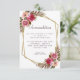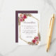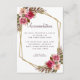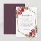 Elegante e formal O cartão de informações de casamento apresenta informações de casamento românticas em aquarela exibidas em folhagens verdes em um fundo branco crocante. Uma moldura geométrica em forma de cristal em cor dourada brilhante fornece um toque moderno. A redação tradicional e clássica fornece sofisticação atemporal. Personalize os detalhes do casamento para seus convidados em letras e caligrafia elegantes na cor roxo cassis. O verso do cartão é um roxo cassis sólido correspondente.