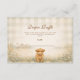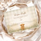 Um charmoso design rural com um bezerro fofinho, um cordeirinho doce e pintinhos amarelos aninhados entre flores silvestres macias de prado. O fundo de pergaminho quente e tons terrosos suaves criam uma atmosfera acolhedora e rústica com um toque de conto de fadas. Folhas delicadas enquadram o layout enquanto a ilustração de animais da fazenda adiciona calor e personalidade. Perfeito para uma celebração neutra com tema rural e charme clássico de fazenda.