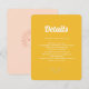 Um cartão de inserção de casamento com tipografia branca retrô é uma escolha elegante e única para uma ocasião especial. As letras negritas e brilhantes se destacam contra o fundo amarelo, criando um contraste visual impressionante. O cartão de apoio da parte de trás do cartão de inserção é aprimorado pela adição de detalhes de design de monograma floral em um fundo de cor de pêssego claro, adicionando um toque de capricho e alegria ao design geral.