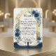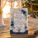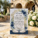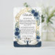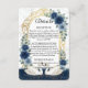 Defina o tom para uma noite encantada com este inserto de detalhe de recepção elegante. Com cisnes românticos e florais azul-marinho profundos para um conto de fadas sofisticado. Este design apresenta uma composição sofisticada começando com uma textura de fundo de mármore branco impresso sobreposta por um arco ornamentado de filigrana em folha de ouro falso. A moldura superior é adornada com rosas em aquarela em tons de azul-marinho, ardósia e azul poeirento, acentuadas por folhas de eucalipto verde-sage. Na base, um par de cisnes brancos flutua em uma ilustração digital de água, refletindo um céu noturno celestial salpicado com purpurina dourada impressa. A tipografia combina um cabeçalho de letra cursiva elegante com texto de corpo serifado tradicional em um layout formal. Esta é uma imagem impressa plana com efeito de folha de
