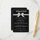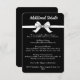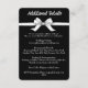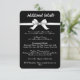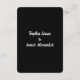 Cartão preto e branco elegante que fornece detalhes importantes para o dia do casamento, incluindo acomodações, código de vestimenta e informações de RSVP. Companheiro perfeito para salvar a data ou o conjunto de convites.