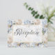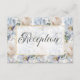 Este design de cartão de recepção de casamento apresenta um belo padrão floral rústico azul e branco suave em um fundo envelhecido azul pervinca empoeirado. O texto é exibido em uma área de texto transparente branco suave com uma moldura dourada falsa cintilante. A parte de trás continua o padrão floral. Este cartão faz parte da suíte de casamento Azul e Branco Floral Rústico Moldura Dourada criada pela Simply Farmhouse Press.