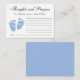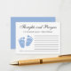 Cartão do serviço de homenagem do bebê para os participantes escreverem uma nota de simpatia aos pais e orações pelo bebê que apresenta "Pensamento e Oração" em uma elegante escrita formal, os nomes dos pais e do bebê em tipografia serif clássica e uma aquarela azul pastel de pés de bebê.