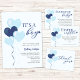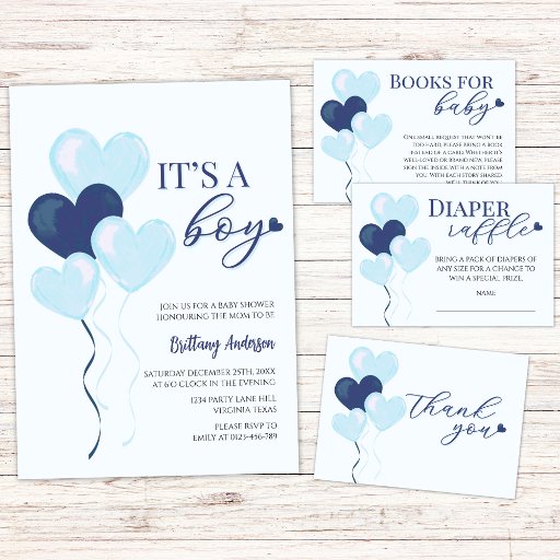 This design features Valentines themed baby shower with the title "It's a Boy" and blue heart balloons watercolor illustration. This product can be easily personalized with your details.