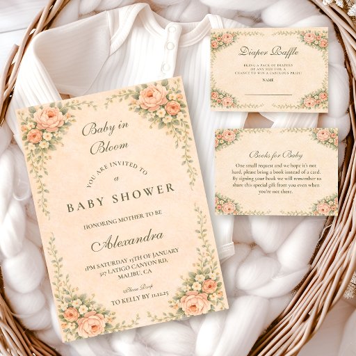 An ornate floral arch of peach and buttercream roses surrounds this romantic garden-inspired design, creating a soft heirloom aesthetic with timeless charm. Delicate greenery, layered blossoms, and a classic oval frame give it a refined Victorian feel while keeping the layout airy and balanced. Perfect for a spring celebration, garden brunch, or elegant afternoon gathering. The structured botanical border frames your event details beautifully while maintaining a graceful, storybook finish.