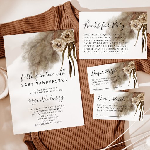 Livros modernos e boho para chá de bebê com tema de amor no outono, com ilustração em aquarela de grama pampas com flores brancas. Este cartão que os convidados tragam livros em vez de um cartão. Envie-o com o convite. Ótimo para um chá de bebê neutro de outono.