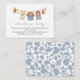 The back of the card showcases a stylish blue and white cow print pattern, adding a modern farmhouse flair and tying beautifully into your western baby shower décor.