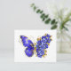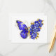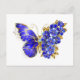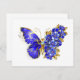 Borboleta de flores cinza, azul, safira, espumante com asa decorada com flores preciosos azuis com folhas de ouro sobre fundo branco.