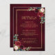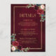 Cartão de detalhes de casamento floral em tons de vermelho borgonha, rosa e azul naval com moldura dourada e letras douradas com folhagem botânica verde e folhas de eucalipto em fundo azul-marinho. Este lindo design fácil de personalizar pode combinar facilmente com as cores, estilos e tema do seu casamento e é uma escolha perfeita para casamentos de outono, verão ou inverno. Você pode encontrar mais designs correspondentes na minha loja ou entrar em contato comigo se precisar de ajuda na personalização do design.