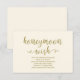 Celebre o início de sua jornada junto com o nosso elegante e trabalhado "desejo de lua de mel" convite para o casamento, o tema dourado amarelo. Apresentando uma sofisticada mistura de escrituras modernas e atração romântica, cada cartão é meticulosamente projetado para transmitir a essência do seu dia especial. Perfeitamente adequado para casais que buscam uma forma única de compartilhar seus sonhos de lua de mel, este cartão convida seus entes queridos a contribuir para experiências inesquecíveis. Seja aninhado em um envelope luxuoso ou apresentado ao lado de seus convites de casamento, nosso cartão adiciona um toque de encanto à sua celebração, prometendo memórias queridas que duram uma vida inteira. Projetado por TeeshaDerrick.