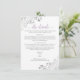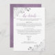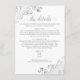 Esta bela placa de gabinete foi projetada para fornecer aos seus convidados informações adicionais sobre recepção, acomodações, arranjos de viagem, registro, site, instruções ou quaisquer outras especificações que os seus convidados possam exigir. Possui um design simples, mas elegante, com lavanda ou roxo claro e texto de cinza sobre fundo branco, um título de script antigo, e caramujos e espirros de folhas prateadas friamente nos cantos.