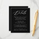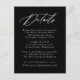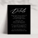 Nossa coleção de casamento Caligrafia Elegante apresenta um belo script de caligrafia branca com um fundo preto. Personalize este cartão de inclusão de casamento correspondente com detalhes importantes do casamento, como acomodações de hotel, site do casamento, arranjos de viagem, recepções de boas-vindas e muito mais. O cartão de detalhes de casamento preto e branco é perfeito para casamentos formais e casuais de qualquer estação.