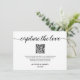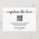 Apresentando nosso "Cartão de compartilhamento de fotos personalizado de casamento com código QR" - uma forma personalizada e conveniente de encorajar os convidados a compartilhar suas fotos do seu dia especial. Este cartão apresenta um código QR personalizado que os convidados podem analisar para aceder facilmente à sua plataforma de partilha de fotografias de casamento. Personalize todos os detalhes para tornar este cartão exclusivamente seu. Design simples, preto e branco que você pode personalizar com uma mensagem junto ao código QR. O código de QR personalizado torna simples para os hóspedes compartilhar suas fotos, garantindo que você captura cada momento precioso de sua celebração. Perfeito para aprimorar sua experiência de casamento e capturar memórias, este cartão de compartilhamento de fotos combina o estilo com funcionalidade. Faça uma declaração com este cartão projetado de forma exclusiva que adiciona um toque de conveniência aos seus esforços de compartilhamento de fotos de casamento.