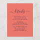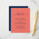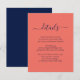 Forneça aos seus convidados detalhes importantes com este elegante cartão de inclusão de casamento azul naval e coral moderno com uma fonte de letra moderna. Itens correspondentes disponíveis.