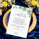 Um cartão de cerimônia de casamento radiante e colorido com uma bela folhagem botânica verde-aquática e folhas de eucalipto. Compartilhe informações importantes com elegância usando este cartão de cerimônia de detalhes floral amarelo, azul e branco. Apresentando um sofisticado design adornado com delicados floresces amarelos, florais brancos macios e acentos azuis graciosos, este cartão complementa maravilhosamente a sua suíte de casamento. Os detalhes refinados de tipografia e aquarela criam uma estética de eterno e na moda, perfeita para fornecer direções locais, detalhes de acomodação ou notas especiais para seus convidados. Ideal para casamentos de primavera e verão, comemorações de jardins ou cerimônias de beachside, este cartão de cerimônia adiciona um toque perfeito e polido à sua papelaria de casamento.