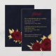 Cartão de detalhes de casamento navy chique e elegante com belas flores burgundy e folhas douradas elegantes.