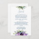 Cartão de inclusão de design floral roxo e verde com texto azul-marinho em um fundo branco crocante. Este cartão chique combina elegância atemporal com conveniência moderna, pois inclui um código QR discreto para fácil acesso a detalhes adicionais do casamento. O motivo floral vibrante adiciona um toque de sofisticação aos seus convites, tornando este cartão de inclusão a combinação perfeita de tradição e inovação para o seu dia especial.