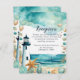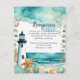 Belo cartão de recepção de casamento com um farol preto e branco náutico, estrelas-do-mar e conchas. Perfeito para um casamento. As palavras podem ser alteradas para se adequarem aos seus próprios detalhes ou requisitos