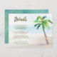 Este cartão de informação de convidado de casamento tropical apresenta uma paisagem de praia de palmeira de aquarelas em tons de chalé, azul e bege de areia. Seus detalhes de casamento, como acomodações de hotéis, informações de recepção bem-vindas e sites na web, estão em cartazes dourados. O lado inverso é uma textura pintada manualmente em tons de azul aqua inspirados no oceano. Projetado para coordenar com a minha coleção Tropical ParadiseWedding.