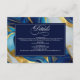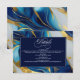 Um cartão de cercado de casamento com um dourado falso, design azul e branco marmoreado.