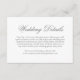 Cartão de cerimônia tradicional com a palavra "detalhes" numa caligrafia elegante. Todo o texto está em cinzas médias sobre um fundo branco e pode ser alterado para qualquer cor desejada clicando no botão "personalizar". Use esses cartões de cercado para fornecer instruções e outros detalhes importantes de casamento que seus hóspedes talvez precisem conhecer, como acomodações de hotel, estacionamento, informações sobre ônibus, etc. Este design clássico é perfeito para um casamento formal.
