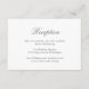 Cartão tradicional de cerimônia de núpcias com o título "Recepção" em caligrafia e detalhes do evento abaixo. Todo o texto está em uma cinza média sobre um fundo branco e pode ser alterado para qualquer cor desejada clicando no botão "personalizar". Estas placas de gabinete são uma adição perfeita à sua suíte se a sua recepção for mantida em um local diferente da sua cerimônia. Este design clássico é perfeito para um casamento formal.
