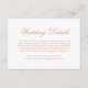 Cartão de cerimônia tradicional com a palavra "detalhes" numa caligrafia elegante. Todo o texto está em rosa dourado falso sobre um fundo branco e pode ser alterado para qualquer cor que você desejar clicando no botão "personalizar". Use esses cartões de cercado para fornecer instruções e outros detalhes importantes de casamento que seus hóspedes talvez precisem conhecer, como acomodações de hotel, estacionamento, informações sobre ônibus, etc. Este design clássico é perfeito para um casamento formal.