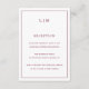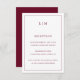 Simples cartão de gabinete de casamento com um design moderno, mas elegante, com seu monograma de duas letras no topo junto com suas informações de recepção cercadas por uma fina borda. Todos os elementos de design estão em burgundy e podem ser alterados na ferramenta de edição de design. Um design chic e na moda que é excelente para um casal minimalista. Estas placas de gabinete são uma adição perfeita à sua suíte se a sua recepção for mantida em um local diferente da sua cerimônia.