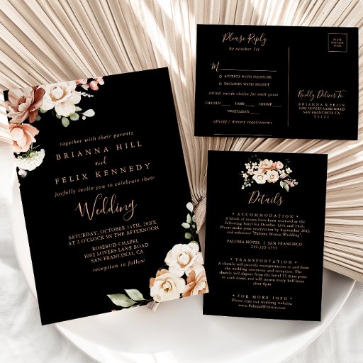 Este casamento floral real e preto que desejava um bom cartão é perfeito para um casamento moderno. A design apresenta cor-de-água rosa, pincel e flores brancas elegantes com folhas esmeraldas verdes.