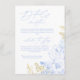 Cartão de casamento moderno branco e flores azuis com pó de ouro são elegantes e clássicos. O design apresenta uma fonte manuscrita e um design minimalista moderno. Para alterar os detalhes, clique em "Personalizar".