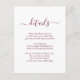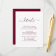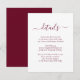 Forneça aos seus convidados detalhes importantes com este elegante cartão de inclusão de casamento moderno borgonha com uma fonte de letra moderna. Itens correspondentes disponíveis.