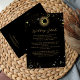 Cartão de cerimônia de casamento místico celestial, personalizado, com galáxia do céu à meia-noite com poeira estelar, lua crescente e outros símbolos astrológicos em cores pretas e ouros. Este cartão é facilmente editável. Se precisar de ajuda para a personalização desta placa ou se precisar de mais produtos correspondentes para esta coleção, envie-me gentilmente através do Zazzle.