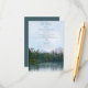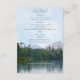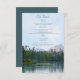 Este cartão de detalhes de casamento de paisagem rústica cênica apresenta um esboço de pastéis a óleo de um lago levemente encrespado, mas calmo, com distantes árvores sempre-verdes exuberantes, árvores de cedro e estruturas de rochas refletidas em sua superfície, e montanhas distantes sob um céu azul com nuvens tênues do ponto de vista de um remador em um kayak no lago ou de um caminhante na margem oposta - o texto com fontes mistas é uma cor azul teal escura coordenada - por katz_d_zynes