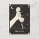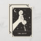 Esta placa Boho Save The Date apresenta um design de estilo de placa tarot celestial em uma paleta de cores preta e creme. A ilustração mostra uma mão segurando um telefone retrô. O fundo tem uma lua e estrelas cintilantes. Isso seria perfeito para qualquer um que tivesse um casamento temático de Halloween ou Spooky com um tema de palmica ou fortuna.