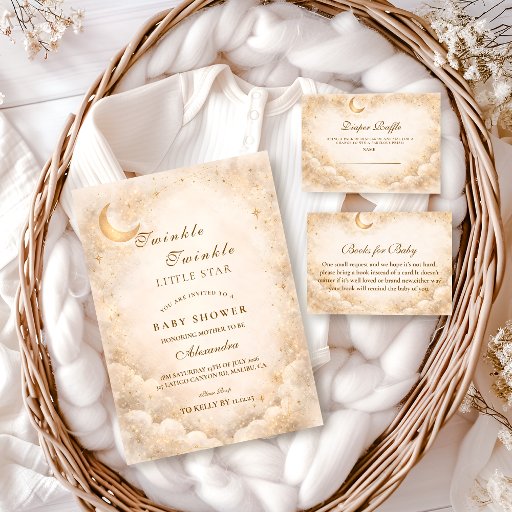 A dreamy celestial design inspired by soft starlit skies and golden moonlight. Delicate crescent moons and scattered stars frame a warm ivory background, while refined gold typography creates an elegant, timeless feel. Perfect for a classic, gender-neutral celebration with a touch of sophistication. Ideal for mamas who love soft neutrals, subtle sparkle, and a graceful, storybook atmosphere.