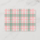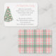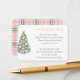 Este design de cartão de chá de fraldas apresenta uma árvore de natal de cores aquáticas inteligente decorada em rosa e branco. Estes elementos aquosos foram originalmente pintados por mim antes de serem digitalizados em forma digital. O verso apresenta uma rosa claro e um padrão verde de tartan / xadrez.
