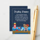 Esta placa de chá, fofa e divertida, apresenta um urso marinheiro náutico num pavimento de madeira com uma gaivota e um caranguejo. Ao fundo há um farol vermelho e branco, um pássaro giro em um veleiro, ondas oceânicas e um céu azul marinho estrelado à noite. O texto combina fontes em negrito e sem serifa para uma aparência na moda e moderna. Isto é perfeito para um chá de fraldas temático náutico.