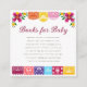 Embrace the spirit of celebration with this 'Books for Baby' enclosure card, showcasing a lively Mexican fiesta theme. Colorful papel picado banners and cheerful flowers frame the heartwarming message, encouraging guests to bring a book instead of a traditional card. This unique request helps start your baby's literary journey with a collection of treasured stories and heartfelt notes. It's an ideal way to add a festive and memorable element to your baby shower, celebrating new beginnings with joy and tradition.