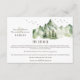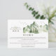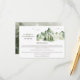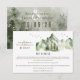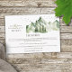 Pintagem paisagística em aquarelas, aves voadoras e montanhas ao fundo. Ilustração serena e calma com pinheiros e silhuetas de aves voadoras. Certifique-se de que o seu convidado obtenha todas as informações do seu dia especial com este cartão de gabinete detalhado.