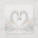 Cisnes adornam a frente e verso destes cartões de confirmação de presença de casamento oferecendo uma estética romântica. Com tons suaves de branco e cores prata escuro. Basta adicionar os detalhes do seu evento de casamento. Você também pode usar o código QR para sua confirmação de presença, site, lista de presentes de casamento e mais. Ótimo para ocasiões especiais. Use o modelo para criar seu próprio cartão de confirmação de presença de casamento de cisne romântico com código QR.
