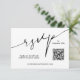 Esses modernos cartões de cerimônias de casamento preto e branco são uma maneira fácil para seus convidados RSVP no seu site de casamento. Inclua seu próprio código QR e seu site de casamento na frente e informações adicionais na parte traseira (exclua nosso texto para deixar o vazio de trás). A cor das placas pode ser alterada com nossas ferramentas de edição. MAIS TAMANHOS feitos para você em nossa loja. O Serviço de Design ao Vivo pode ajudá-lo com o layout do seu design ou cores, se necessário.