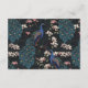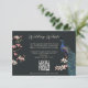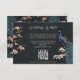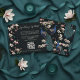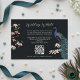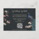 Esta moderna placa de gabinete de código QR do site de Pavão Azul Preto apresenta flores azuis e palatinas desenhadas à mão e um elegante padrão floral e de pássaros no verso, tudo contra um elegante fundo quase negro. Todo texto é editável.