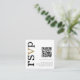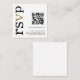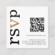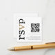 Código QR Dourado Texto Preto Branco Casamento Online RSVP. Uma pequena caixa de 2,5” para incluir ao enviar seus convites para uma forma conveniente para seus convidados responderem. Substitua o código QR de exemplo pelo seu próprio, para criar seu código procure “gerar código QR” online. Um design tipográfico moderno com RSVP em tipografia grande em preto com o ”v” em dourado, rotacionado e à esquerda.