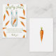 Convites para chuveiros de bebês neutros em termos de gênero. Apresentando o ditado "UM PEQUENO BUNNY ESTÁ A CAMINHO!", uma ilustração de um coelho aquoso (coelho) com cenoura em patas, e muitas cenouras cor de laranja. Itens correspondentes disponíveis.