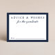 Elegante cartão de encerramento azul para seus anúncios de graduação e convites de festa para familiares e amigos expressarem seus conselhos e esperanças para o futuro do graduado. "Conselhos & Desejos Para o Graduado" é escrito em clássico roteiro azul e tipografia. No verso, personalize com o nome do graduado, escola e ano de turma em tipografia dourada.