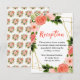 This fun and whimsical wedding reception enclosure card features watercolor coral pink red roses and foliage on a gold geometric frame. The text combines handwritten script and serif fonts for a stylish and modern look. This is perfect for a spring or summer rustic wedding.
